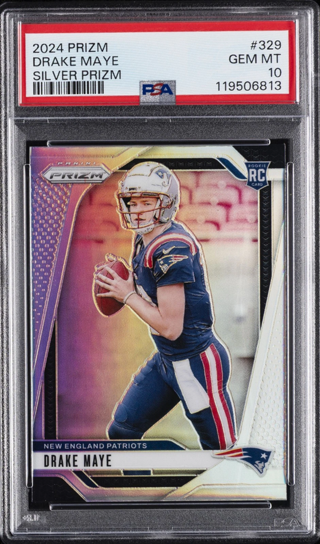 Example: If the maths says a Drake Maye Silver Prizm RC has an EV $300 after grading, but you can buy it raw for $200, there is a $100 expected profit. See more on how to calculate EV here.