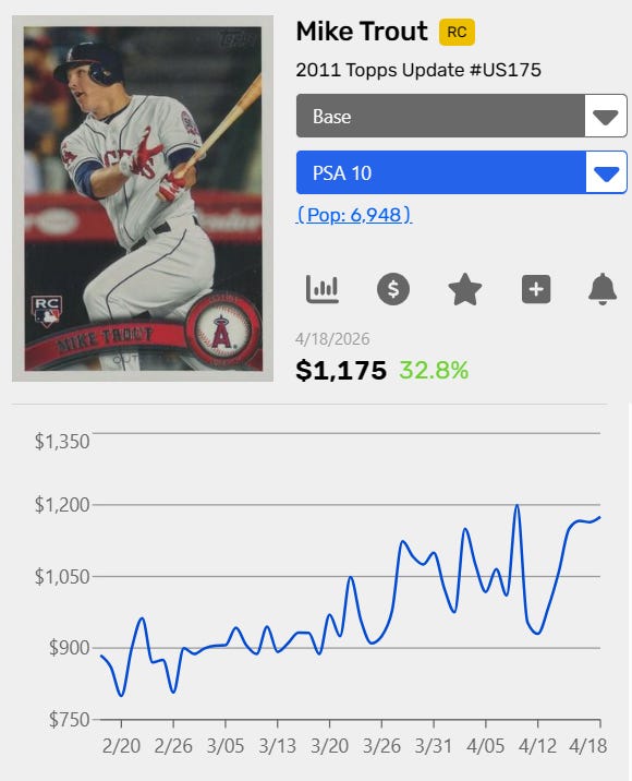 In total, Trout’s PSA 10 card is up 32.8% to $1,175 since mid February, although it’s important to note that this has occurred while the entirety of the baseball card market has been increasing. With that said, this begs the question, has Trout done enough so far in 2026 to warrant this kind of price increase?