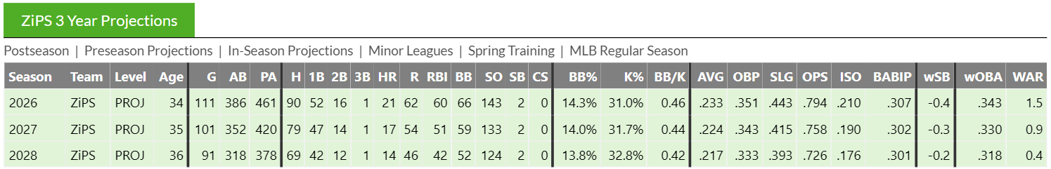 To evaluate this question, we’re going to look at Fangraphs’ 3-year ZiPS projections. This is convenient for 2 reasons. The first is that they’re readily available and considered amongst the most accurate projections. And second, we can look at a 3 year outlook, which is an important window for the 34 year old as he approaches career milestones like 500 homeruns and 100 WAR.