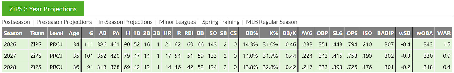 I’m not a projections expert, but I do think ZiPS is overweighting the down season Trout had in 2025. I think there’s a lot of reason to believe that Trout will at least continue to be a great hitter when healthy, even if overall he’s not the same player he was in his prime.