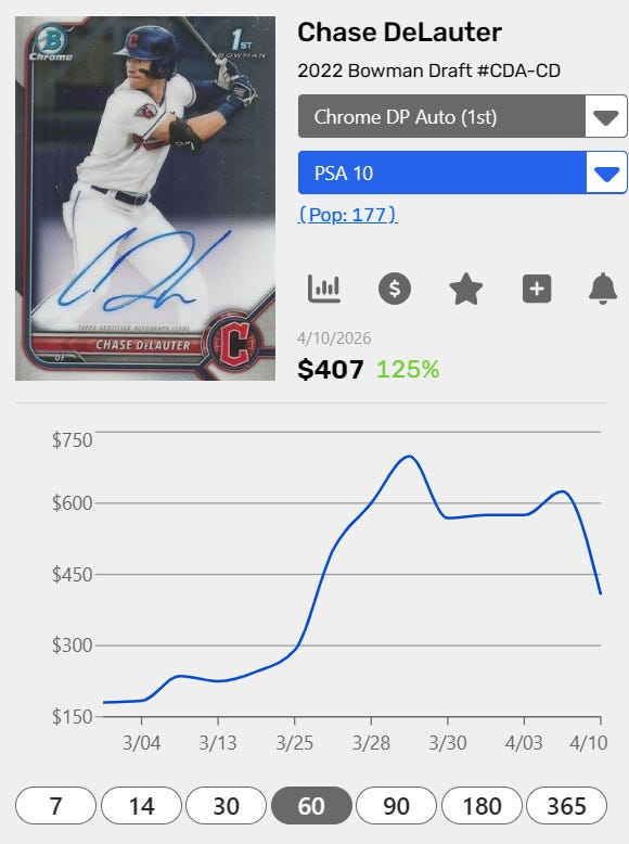 Chase DeLauter, the Cleveland Guardians’ former #2 overall prospect, started his rookie season red hot, hitting 4 home runs in just three games, leading to the big spike you see in his chart above. He’s cooled off a bit since then, but he still boasts a .929 OPS in his first 17 career big league games, leading to his Bowman First Auto increasing 125% since mid-February.