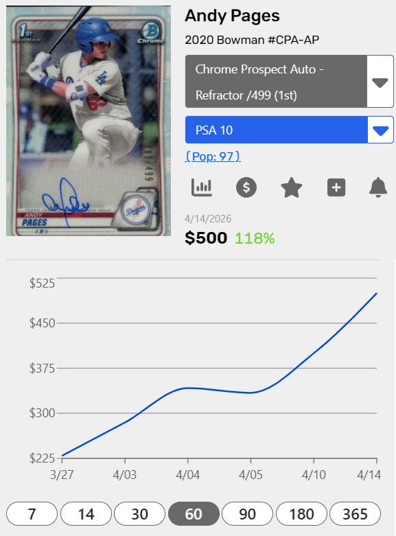Now in 2026, Pages is again off to a hot start, with a league-leading .409 batting average and a 1.148 OPS. Pages has shown he can be a very solid player, and playing for the Dodgers is always good for card values. This is another guy who could emerge as a solid grading target if he can continue his hot start.