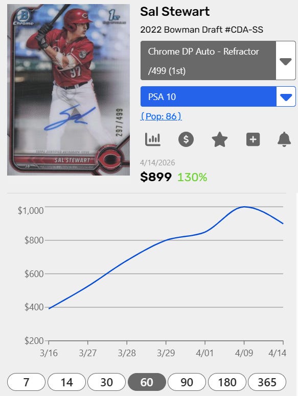 Accordingly, Stewart’s cards are rising with his Bowman First Refractor PSA 10 Auto now reaching nearly $1,000. We are actively targeting Stewart cards to buy and grade now, although we haven’t bought any yet.