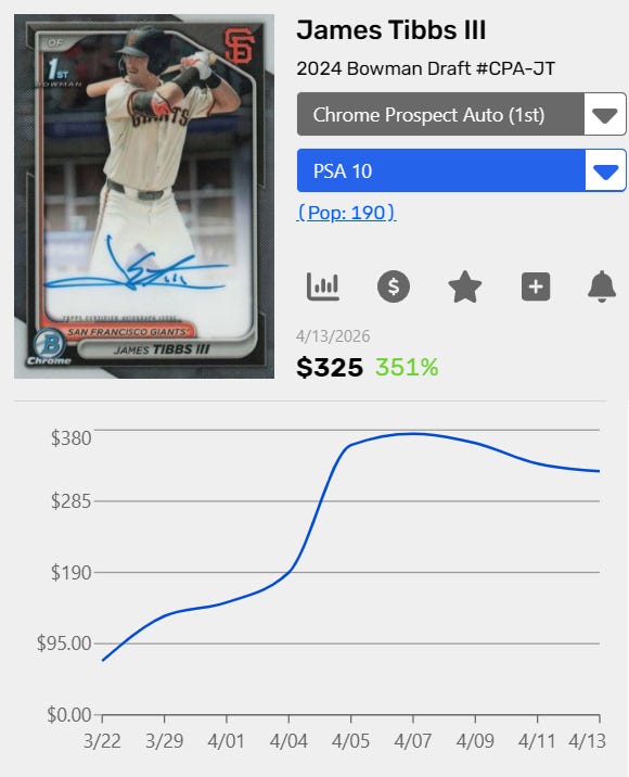 With his Bowman Chrome First Auto just now reaching about $300 as a PSA 10, we’re not buying Tibbs yet, but that could change quickly when he gets called up this season.