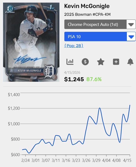 Tack on McGonigle’s recent 8 year $150M contract, and you can imagine why his market continues to surge, with his PSA 10 Bowman First Auto now over $1,000. I could see McGonigle being one of the top players to target if you’re buying and grading baseball cards this season, so keep an eye on his performance through the year.