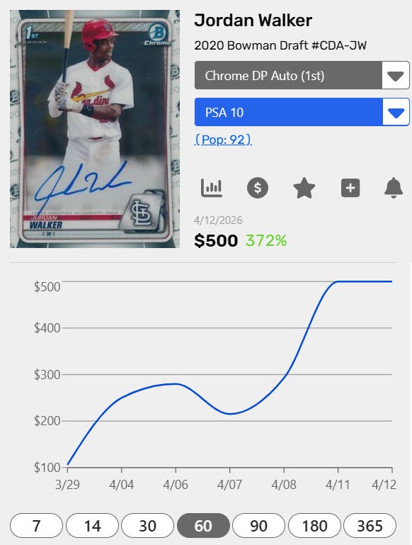 That’s led to Walker’s PSA 10 Bowman First Auto rising to about $500, and firmly entering our radar as a card to look out for this season, especially if Walker’s hot start continues.