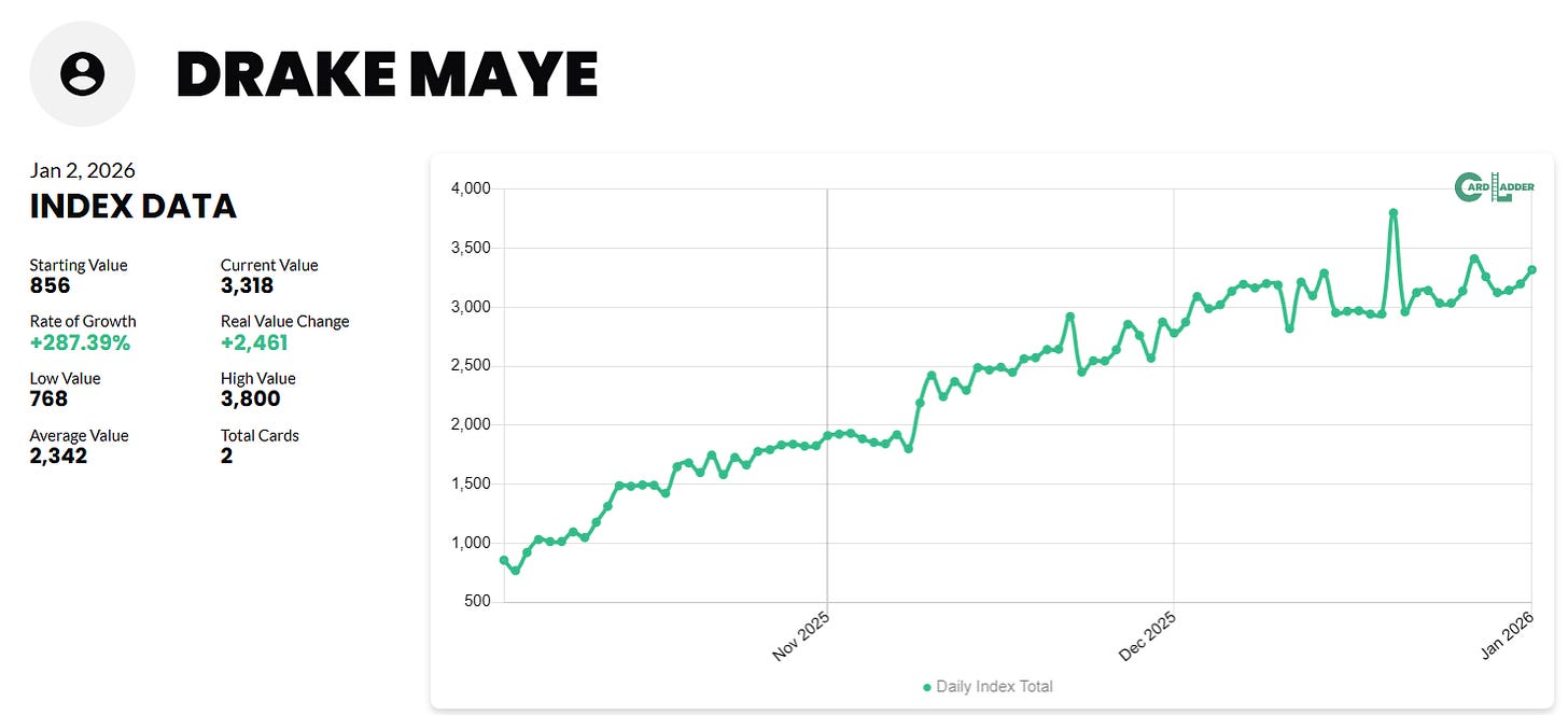 This was the big winner of the sub, as Drake Maye’s market has absolutely exploded this NFL season. We bought this hoping to sell a PSA 10 for about $1,500, so this market roughly doubled since the time we bought it. You can see CardLadder’s Drake Maye index is up 294% over the last 3 months.