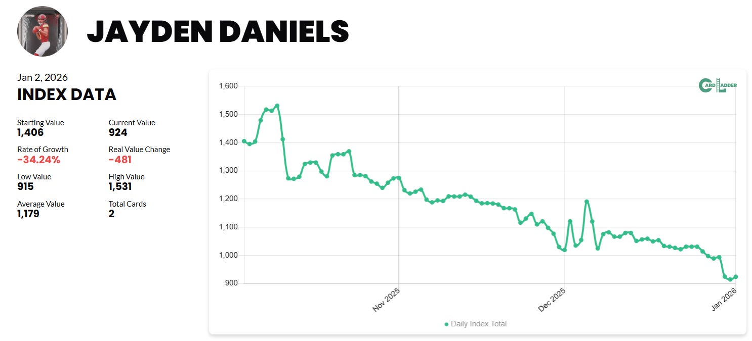 Here’s a look at CardLadder’s Jayden Daniels index, which is down about 33% over the past 3 months.