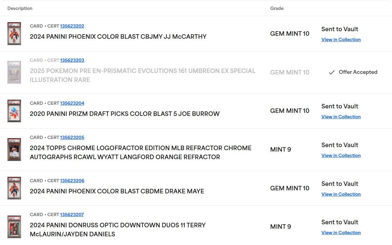 This submission consisted of 6 cards (4 football, 1 baseball, 1 Pokémon) with a total raw value of $4,870 (before submission costs).