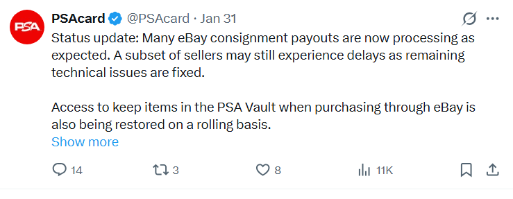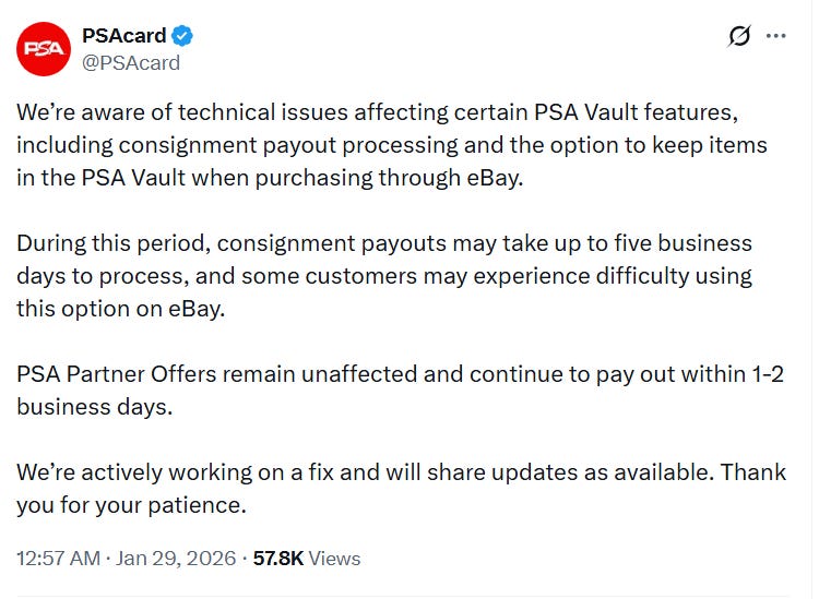 PSA Vault, the main consignment service of PSA, hasn’t been paying out customers for their sales for about two weeks. For us, a resell business that sells all cards through PSA Vault, this is obviously highly disruptive. At this point, we haven’t received payouts for 34 cards and are owed over $10,000. We also have another 50 or so cards ready to list that we can’t post until payments resume.