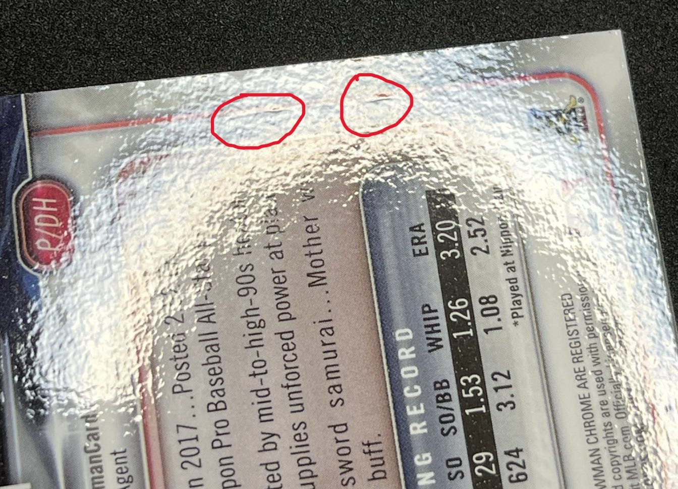We bought this Shohei Ohtani card back in December for a really solid price, but it came in with some flaws that we didn’t notice in the original listing. I’ve attached pictures below of the card, the defects on the card, and our pregrade notes from when we initially evaluated this.