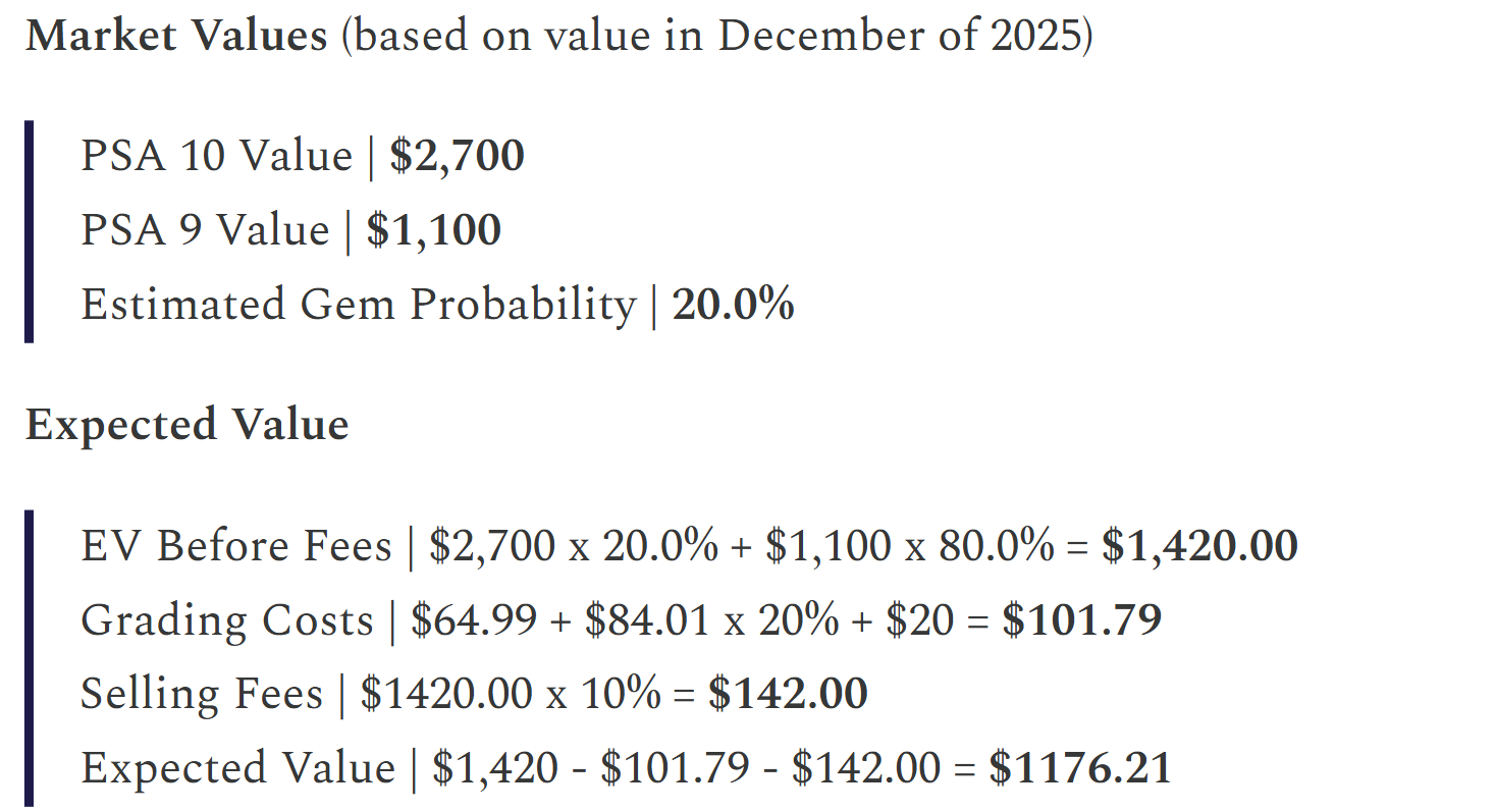 The decision of whether or not to submit this card might seem like a debate about the condition of the card. And to some extent it is. We first identified that the card had a 20% chance as grading as a PSA 10, but what to do with that information is the important part. Ultimately, we used Expected Value to make our decision.