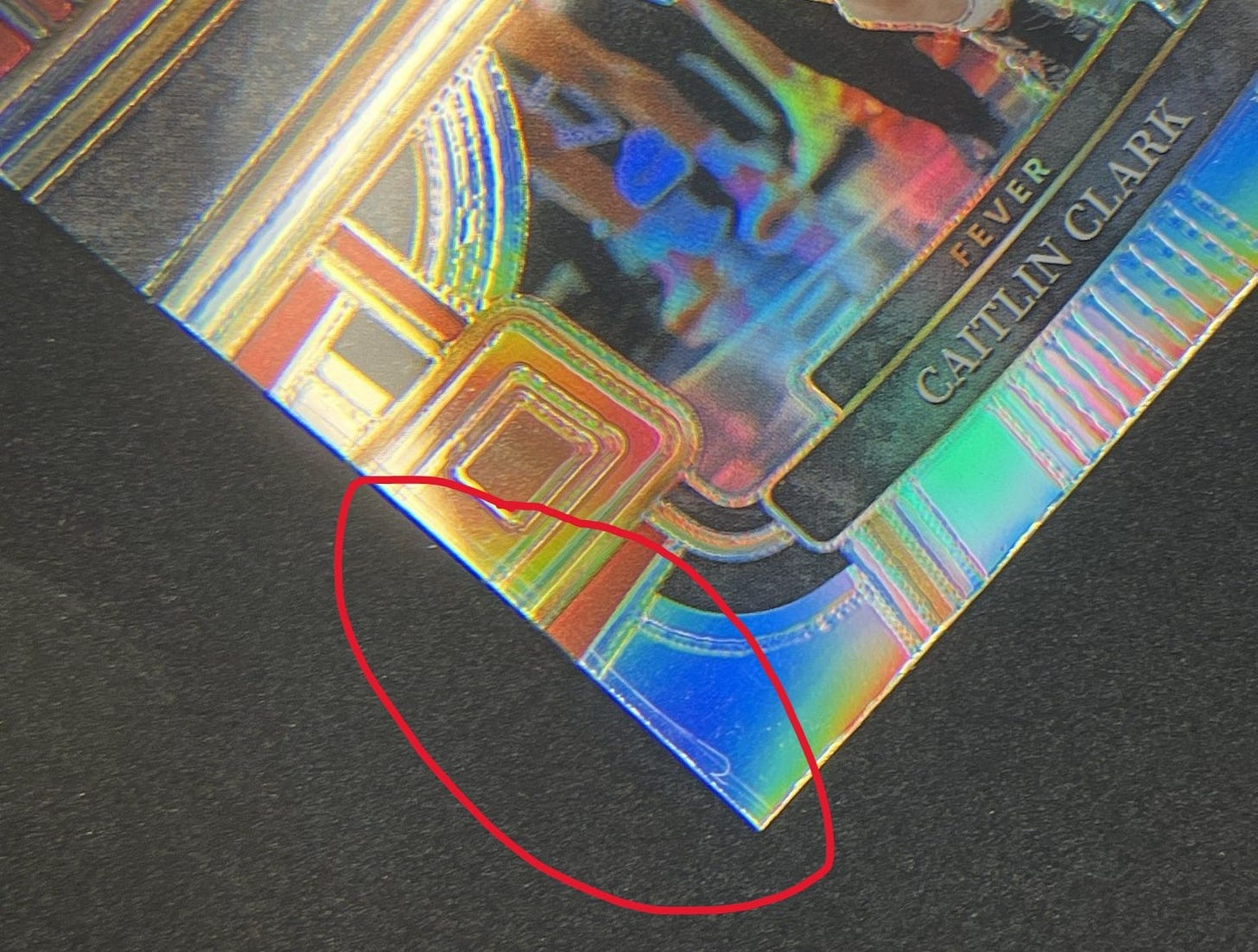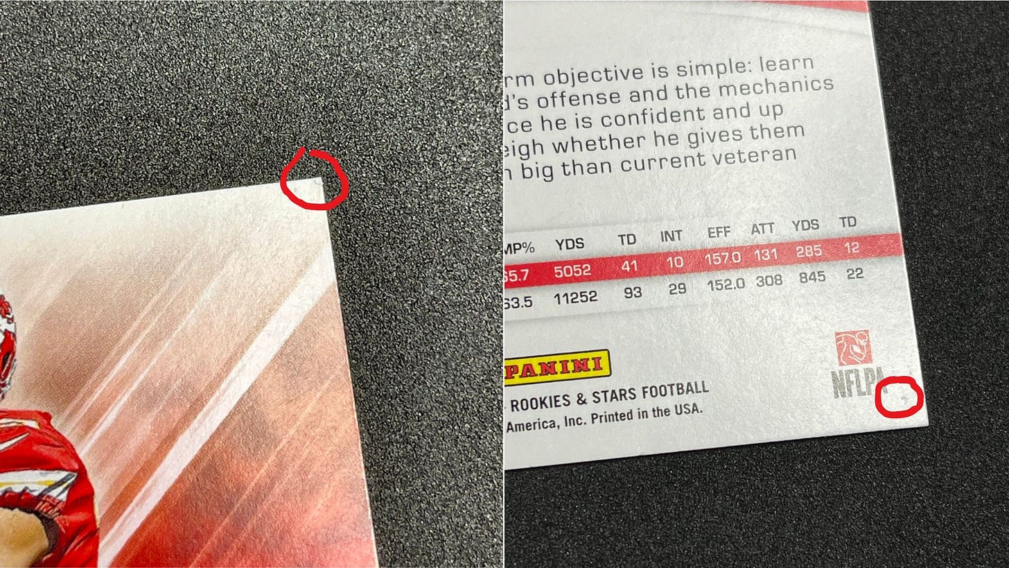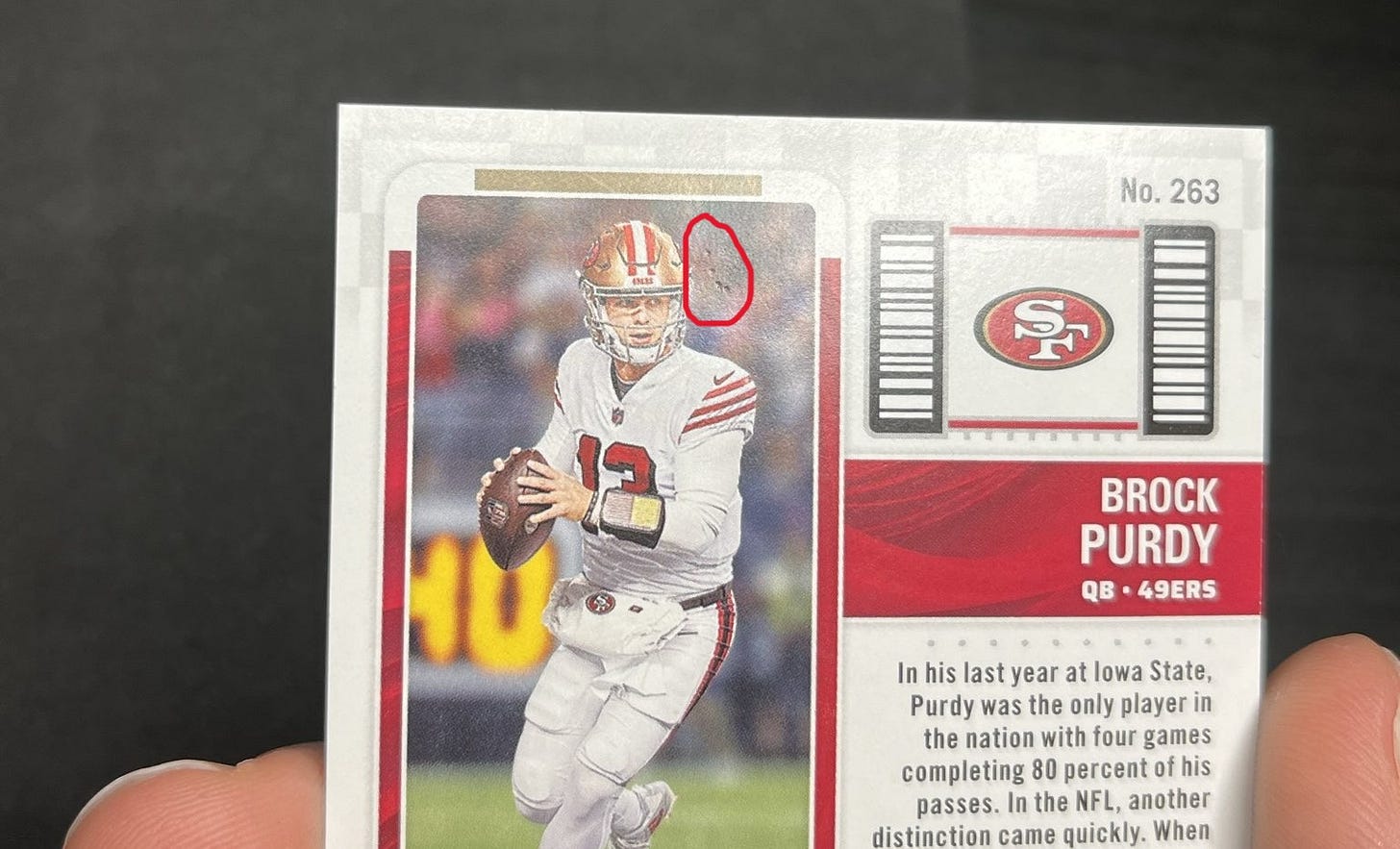 Like the first card, it’s hard to say if these dimples are a factory defect or represent damage applied to the card by the previous owner. With that said, I find that back dimples are less common than front dimples, and I rarely see dimples on Panini Contenders cards. In general, I think that weird issues are worse than common issues, because they are more unpredictable. Given that this is an unusual issue, and that there is not just one dimple but a cluster of 4, we decided not to submit this card.