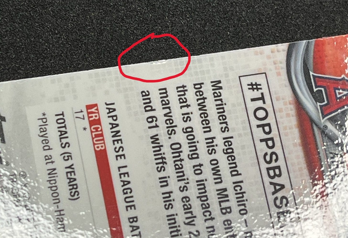 The corner alone is enough to basically guarantee this card won’t gem. The damage is too large, extending into the surface of the card. I think the impact of the dimple is more debatable. If it’s a factory defect, it’s possible that this alone wouldn’t kill the card’s chances of gemming. But if it’s an indent that damaged the card after production, it certainly would kill its chances. Regardless, this is a card that we are not submitting.