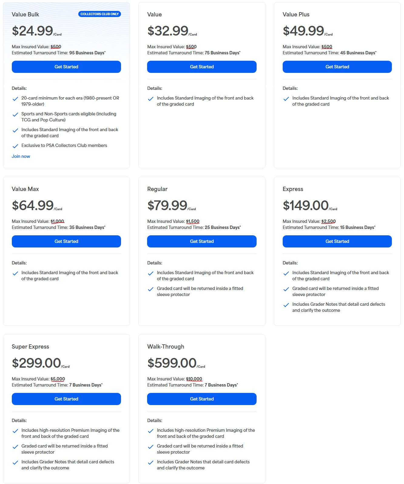 Upcharges are a bit tricky. When you submit a card to PSA, you choose a service level with a corresponding Maximum Insured Value. After grading, PSA re-estimates the card’s value based on its grade. If a card comes back as a PSA 10 and its value exceeds your chosen tier’s Maximum Insured Value, PSA upcharges you to the next tier.