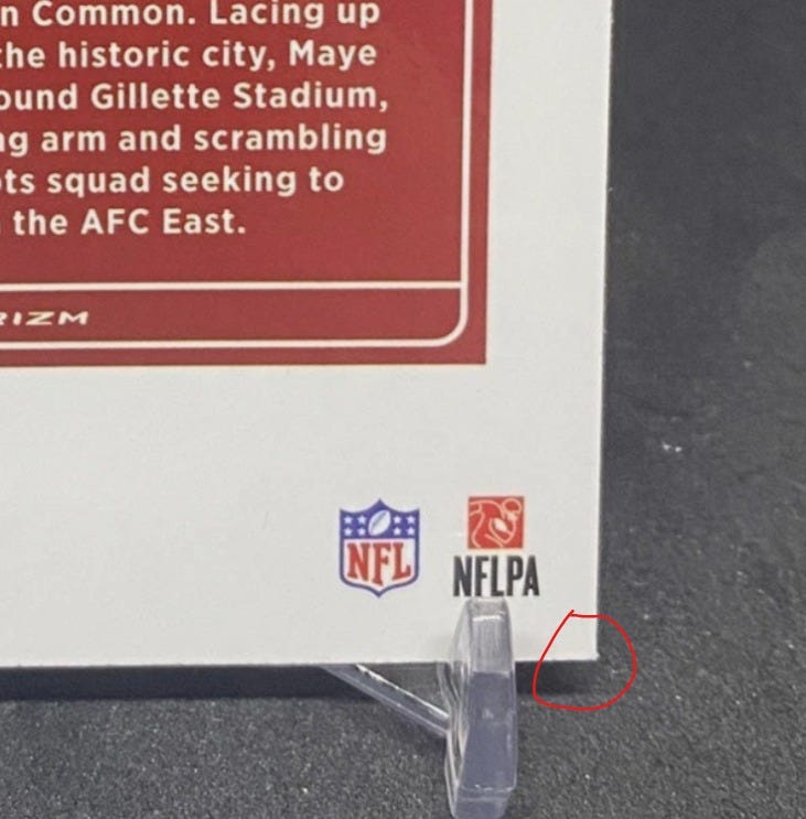 Here’s an example of a Drake Maye Prizm Silver Rookie Card we submitted to PSA. These 2024 Prizm Football cards had horrible quality control, and every copy we’ve gotten has had at least one dimple. And yet, we’ve graded really well on these.