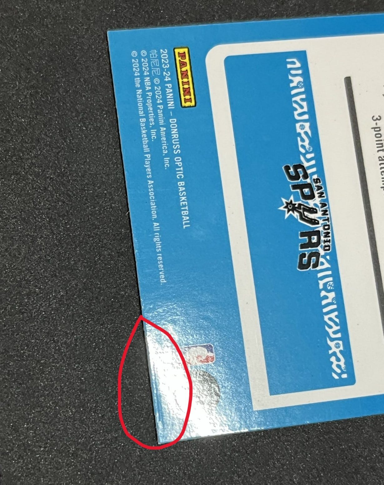Below is an example of an indent on the back of a 2023 Optic Victor Wembanyama Rookie Card which we decided not to submit.