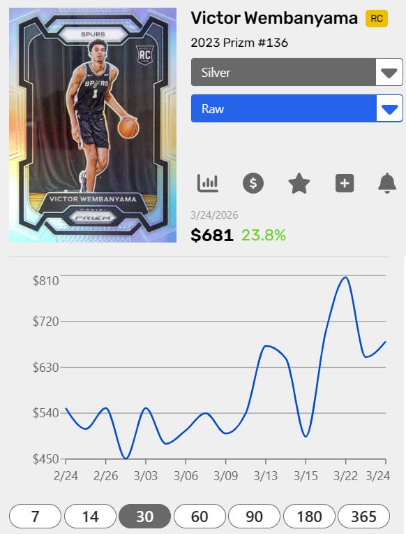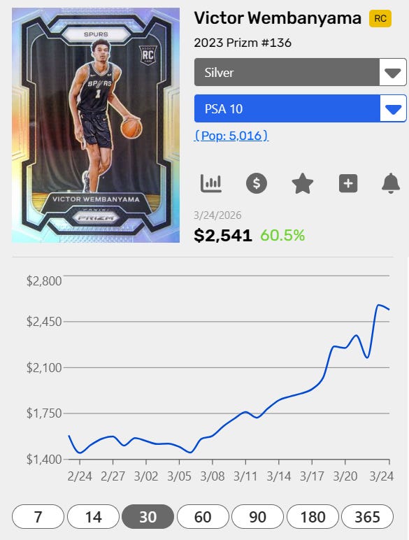 Wemby’s PSA 10 Prizm Silver Rookie Card is up over 60% in the last 30 days: