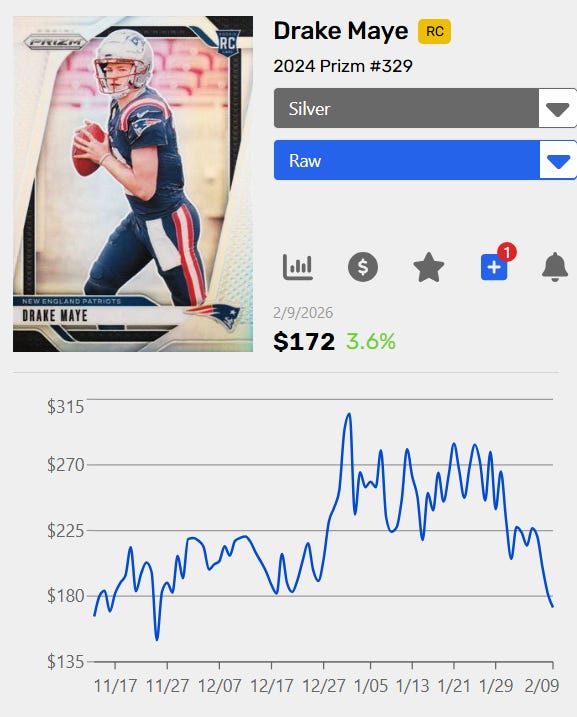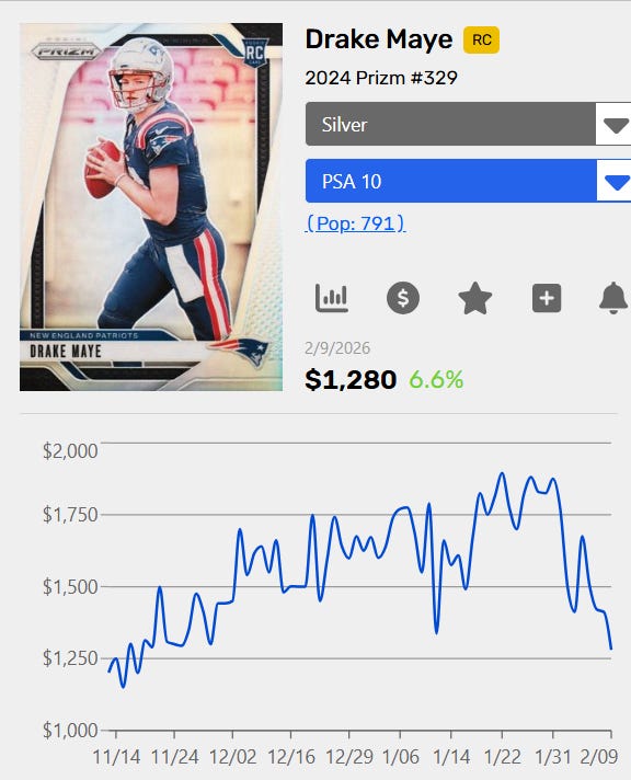 Drake Maye just lost in the Super Bowl, and his cards are falling in value. This is unfortunate for us, as we’ve been buying tons of Drake Maye over the last few months. This post is going to look at how Drake Maye’s market has moved since the loss, and how my investment looks going forward.